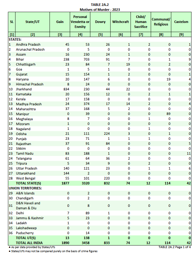 According to the NCRB, 2023 saw a slight drop in murder cases compared to 2022. There were 27,721 murder cases reported in 2023, whereas in 2022, the number stood at 28,522. A total of 9,209 murders took place due to disputes, 3,458 due to personal vendetta or enmity, and 1,890 due to gain.