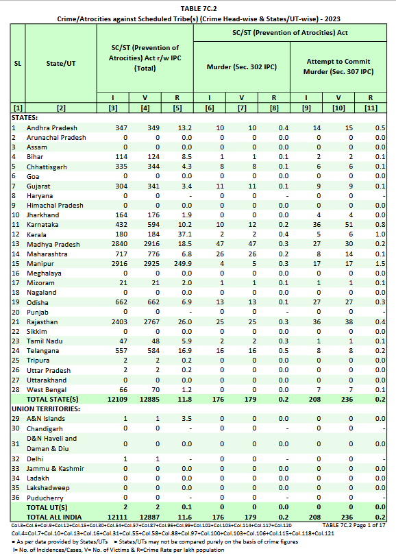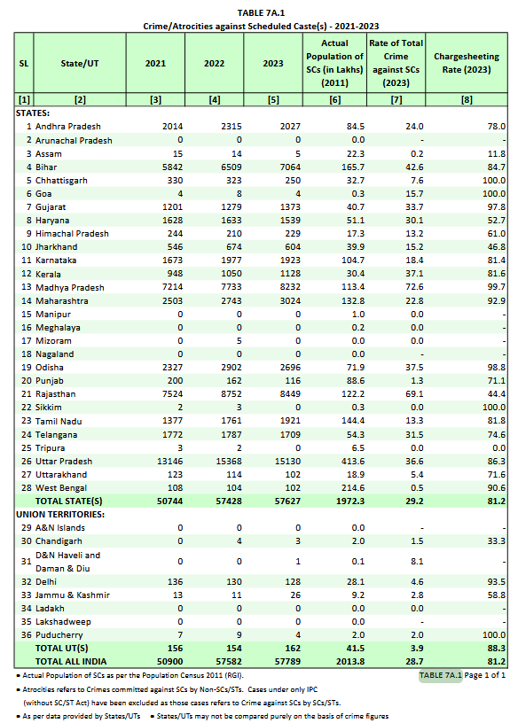 The NCRB reported 57,789 cases against Scheduled Castes, a marginal increase of 0.4% from 57,582 in 2022. The majority involved simple hurt (18,437 cases), criminal intimidation, and offences under the SC/ST Atrocities Act.
