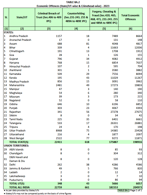 White-collar crimes also increased. A total of 2,04,973 economic offences were registered in 2023, a 6% increase from 1,93,385 in 2022. Most of these, 1,81,553 cases, involved forgery, cheating and fraud (FCF), followed by 22,759 cases of criminal breach of trust and 661 counterfeiting cases.