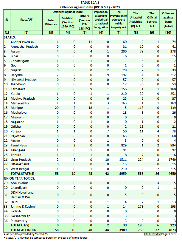 Notably, crimes against the state dropped by 13.1%, falling from 5,610 cases in 2022 to 4,873 in 2023. Most were registered under the Prevention of Damage to Public Property Act (3,989 cases), followed by 750 under UAPA.