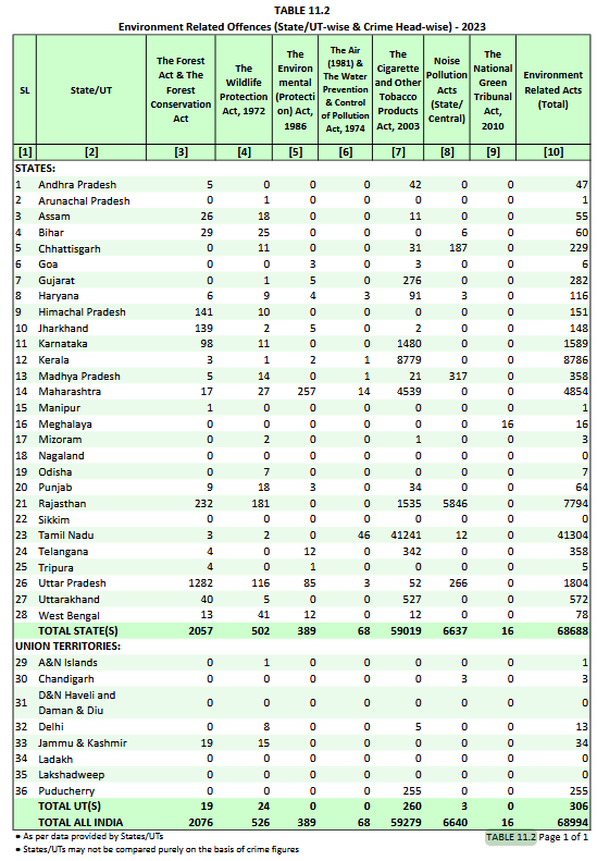 The NCRB registered a sharp 30.4% increase in environment-related offences, with 68,994 cases in 2023 compared to 52,920 in 2022. Cases under the Cigarette and Other Tobacco Products Act (COTPA) accounted for 85.9% (59,279 cases), followed by 9.6% (6,640 cases) under Noise Pollution Acts (State/Central).