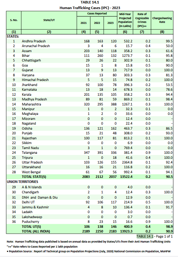 Human trafficking cases showed a slight decline. A total of 2,183 cases were reported in 2023, compared to 2,250 in 2022. There were 6,288 victims, including 2,687 children, and 6,043 victims were rescued. Police arrested 6,024 traffickers during the year.