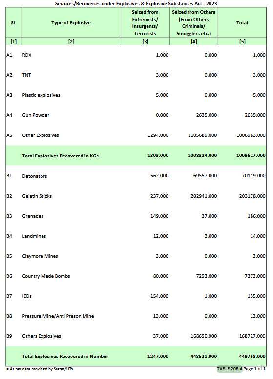 India registered 73,388 Arms Act cases in 2023, with over 82,756 weapons recovered, most of them unlicensed. Explosive recoveries also surged, with over 10 lakh kg recovered in 2023 compared to 88,987 kg in 2022. Authorities also recovered 4,49,768 explosive devices. Fake currency worth ₹16.86 crore, consisting of 3,51,656 notes, was seized in 2023.