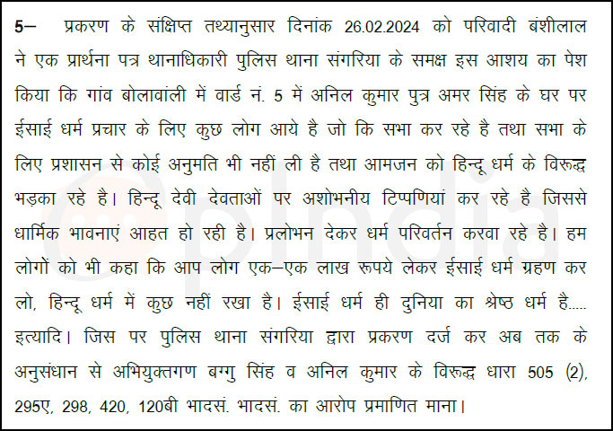 In February 2024, Baggu Singh and his accomplice Anil Kumar were booked by Sangaria police under Sections 505(2), 295A, 298, 420, and 120B of the Indian Penal Code (IPC) on the complaint of Banshilal. According to the court documents of the case accessed by OpIndia, a gathering was held at Anil Kumar’s house in Bolanwali village. Some people had come to preach Christianity. The meeting was organised without any permission from the administration, and during the event, inflammatory remarks were allegedly made against the Hindu religion.