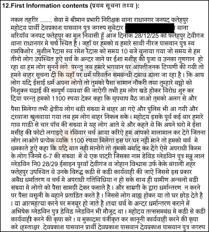 The FIR has been registered on the complaint of Devprakash Paswan under Sections 299 and 351(3) of the Bharatiya Nyaya Sanhita, 2023, along with Sections 3 and 5(1) of the Uttar Pradesh Prohibition of Unlawful Conversion of Religion Act, 2021, against pastor David Gladwin, his son Abhishek Gladwin, and Johan Vishwas alias KK Bengali, along with 5-6 unknown persons.