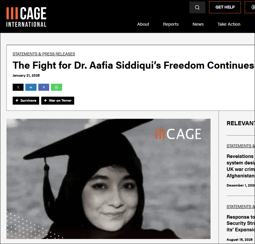 In addition, CAGE International has also advocated for the release of ‘Lady Al-Qaeda’ Aafia Siddiqui, who is serving an 86-year jail sentence after conviction in the case involving an attack on US officials in Afghanistan. OpIndia reported earlier that in 2008, the US Department of Justice had found a number of items in her possession, including handwritten notes that mentioned a mass-casualty attack.