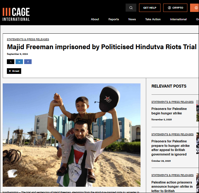 CAGE International, previously known as CagePrisoners Project, is mobilising support for Majid Freeman ahead of his retrial in the Leicester case on 9th January. In a flyer, CAGE International described Freeman as a ‘humanitarian’ and ‘anti-genocide activist’. It claimed that he was “convicted in a politicised trial for the crime of defending the Leicester community during Hindutva-inspired riots in 2022.”