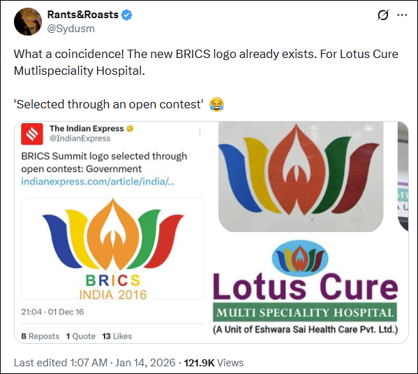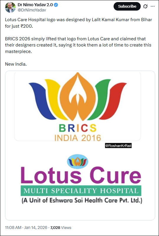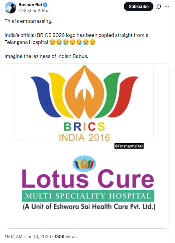 Alleging that the government officials somehow ‘plagiarised’ the BRICS 2026 logo, one pro-Congress troll wrote, “This is embarrassing. India’s official BRICS 2026 logo has been copied straight from a Telangana Hospital. Imagine the laziness of Indian Babus.”
