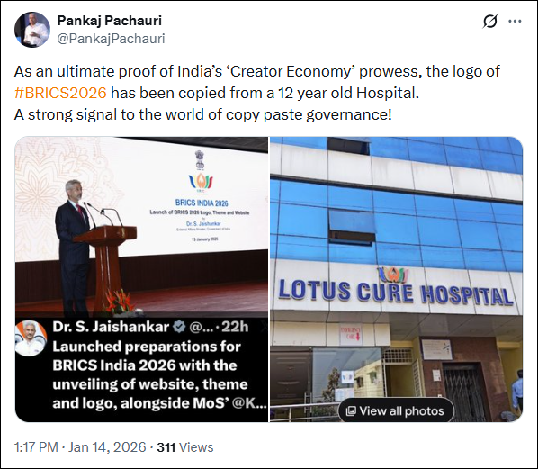 Similarly, ‘journalist’ Pankaj Pachauri, who was media advisor for former Prime Minister Manmohan Singh, amplified the ‘BRICS logo copied from a hospital ’claim on X. “As an ultimate proof of India’s ‘Creator Economy’ prowess, the logo of #BRICS2026 has been copied from a 12 year old Hospital. A strong signal to the world of copy paste governance!” Pachauri wrote.