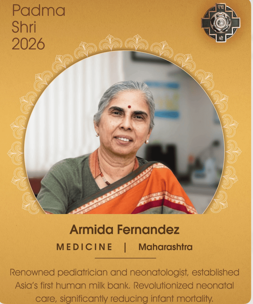 Armida Fernandes from Maharashtra will be conferred the Padma Shri in Medicine for her contributions to reducing infant mortality, including establishing Asia’s first Human Milk Bank and training over two thousand nurses, doctors, and hospital teams across Maharashtra.… pic.twitter.com/CdOfU3TsOT