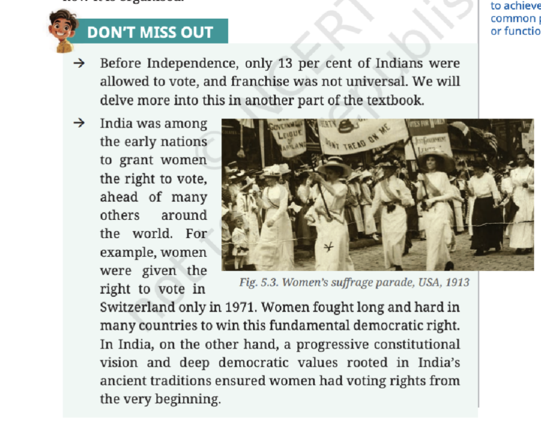 For example, take this mention of universal franchise in India. It is from the chapter ‘Universal Franchise and India’s Electoral System’ in Part 1 of the Social Sciences NCERT textbook. Going beyond just laying cold details that students find dry and unrelatable, the chapter makes a point to remind students why the universal franchise was important for a newly independent India. And how, the early leaders, displaying a more progressive and forward-thinking attitude than many European nations at that time, decided that women of India will also vote, granting them equal rights as citizens of this nation.