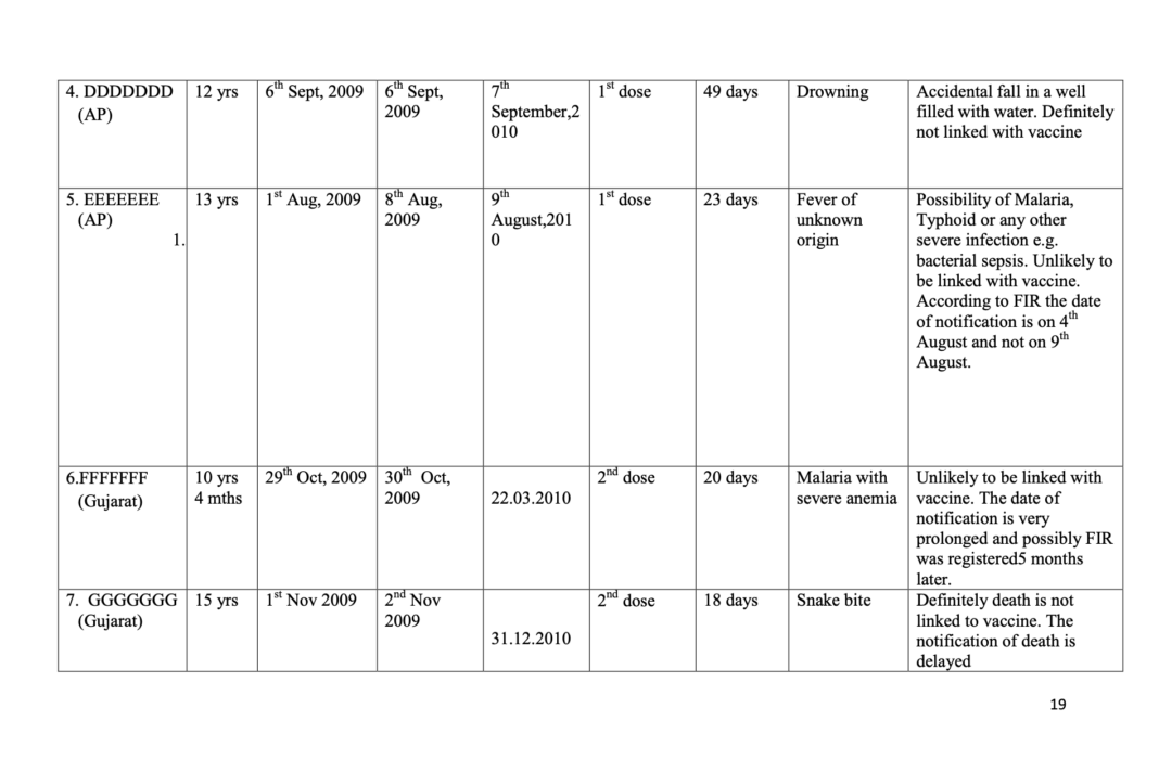 In Andhra Pradesh, the causes of deaths found were Organophosphorus poisoning (possible pesticide consumption by a 14-year-old girl), another similar case of suspected pesticide consumption by a 13-year-old girl, one case where the exact medical diagnosis was uncertain but unlikely to be caused by vaccine, a case of accidental drowning of a 14-year-old girl, a case of malaria and typhoid.