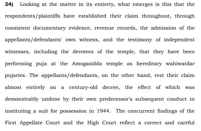 The bench conveyed that it had become clear that the plaintiffs have consistently substantiated their claim through revenue records, consistent documentary evidence, the admission of the witness of the appellants and the testimony of independent witnesses, including devotees who informed that they were performing puja at the temple as hereditary wahiwatdar pujaries.