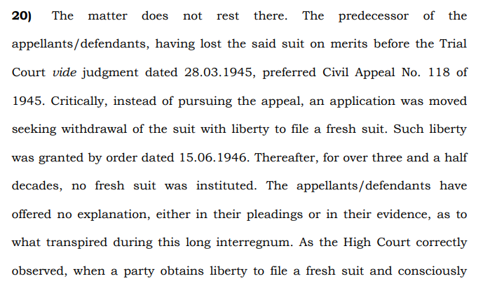 The court emphasised that the predecessor raised a civil appeal after losing the litigation on merits before the Trial Court in 1945 and a motion was brought for the claim to be dropped with the ability to bring a new suit rather than continuing the same. The order permitting it was issued on 15th June 1946 and no new suit was opened for more than three and a half decades after that.