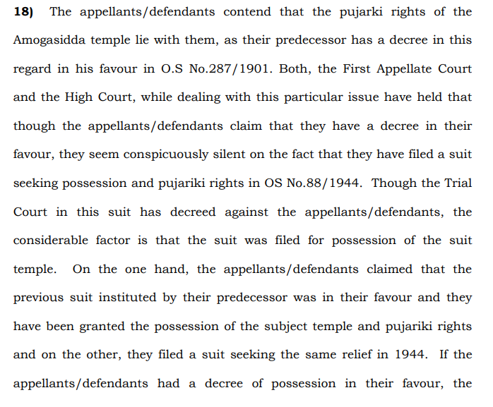 According to the court, the appellants outlined that since their predecessor had a ruling favourable to him in the initial suit (287/1901), they were entitled to the pujarki rights of the temple. When dealing with this specific situation, the First Appellate Court and the high court determined that, they appear to be “conspicuously silent” about the fact that they started the case (88/1944) for possession and the rights in the first place, despite their insistence.