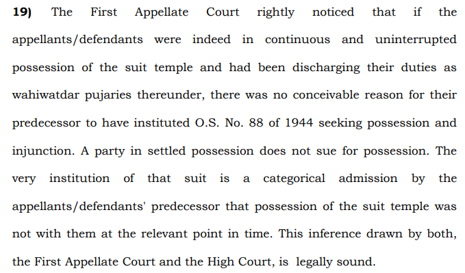 The court stated that the First Appellate Court rightly spotted that there was no plausible reason for their predecessor to have filed the first suit for the temple’s control and an injunction if the appellants were in fact doing their duties as wahiwatdar pujaries and had a continuous and uninterrupted hold over it.