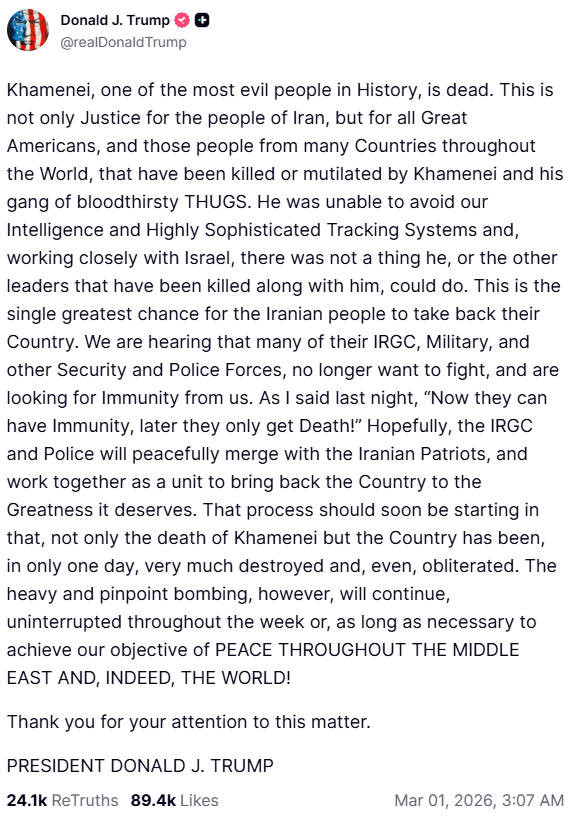 However, before the confirmation by the Iranian media, US President Donald Trump posted a lengthy message on Truth Social around 3:07 am on Friday (local time), celebrating Khamenei’s death. Describing Khamenei as the “most evil person in History”, Trump hailed his death as a mark of justice to the people of Iran, the “Great Americans”, and all those who suffered during Khamenei’s rule.