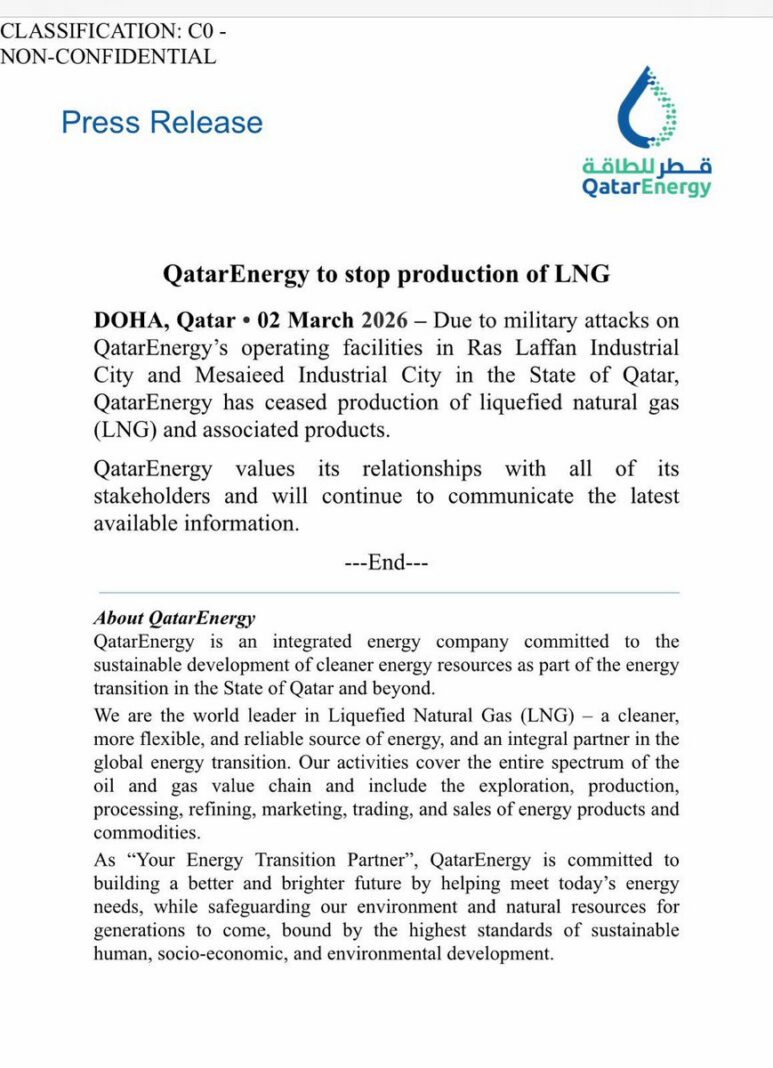 “Due to military attacks on QatarEnergy’s operating facilities in Ras Laffan Industrial City and Mesaieed Industrial City in the State of Qatar, QatarEnergy has ceased production of liquefied natural gas (LNG) and associated products,” a statement issued by QatarEnergy reads.