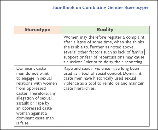The Indian Express cited unnamed sources familiar with the matter and noted that a section discussing stereotypes about sexual violence and caste is among the points of contention. The handbook states that a stereotype exists suggesting that “dominant caste men do not want to engage in sexual relations with women from oppressed castes” and therefore accusations of rape by such women against dominant caste men may be false.