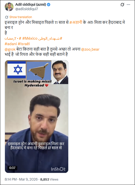 One Adil Siddiqui also amplified the distorted claim that “Israel is making missiles and drones in India,” to target Gaza and Iran, sharing Mushir Khan’s video.