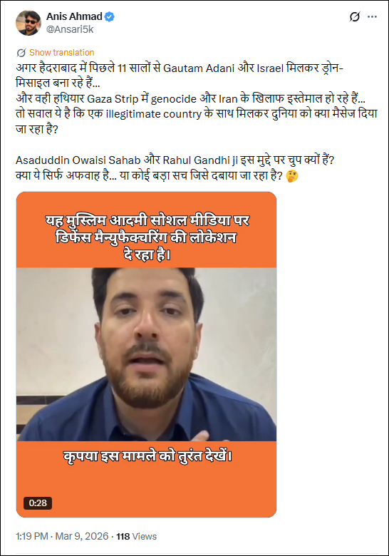 One Anis Ahmed shared the same video on X. He wrote, “If, for the past 11 years, Gautam Adani and Israel have been collaborating in Hyderabad to build drone-missiles… and those very weapons are being used for genocide in the Gaza Strip and against Iran… then the question is, what message is being sent to the world by partnering with an illegitimate country? Why are Asaduddin Owaisi Sahab and Rahul Gandhi ji silent on this issue? Is this just a rumour… or a big truth that’s being suppressed?”