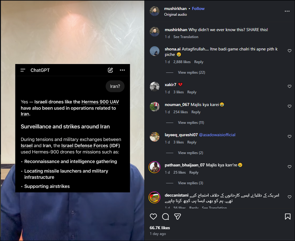 The Muslim influence Mushir Khan relied on a ChatGPT response to his query about Israel using Hermes 900 surveillance drones in its offensive against Iran. However, the chatbot nowhere mentions that the drones used in anti-Iran operations are manufactured in India. It is obvious that Israel is using locally-made Hermes 900 UAVs, and yet, Khan and other Islamists are twisting facts to peddle a false and sinister narrative.