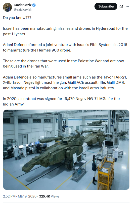 “Do you know??? Israel has been manufacturing missiles and drones in Hyderabad for the past 11 years. Adani Defence formed a joint venture with Israel’s Elbit Systems in 2016 to manufacture the Hermes 900 drone. These are the drones that were used in the Palestine War and are now being used in the Iran War. Adani Defence also manufactures small arms such as the Tavor TAR-21, X-95 Tavor, Negev light machine gun, Galil ACE assault rifle, Galil DMR, and Masada pistol in collaboration with the Israeli arms industry. In 2020, a contract was signed for 16,479 Negev NG-7 LMGs for the Indian Army,” Aziz posted on 9th March.