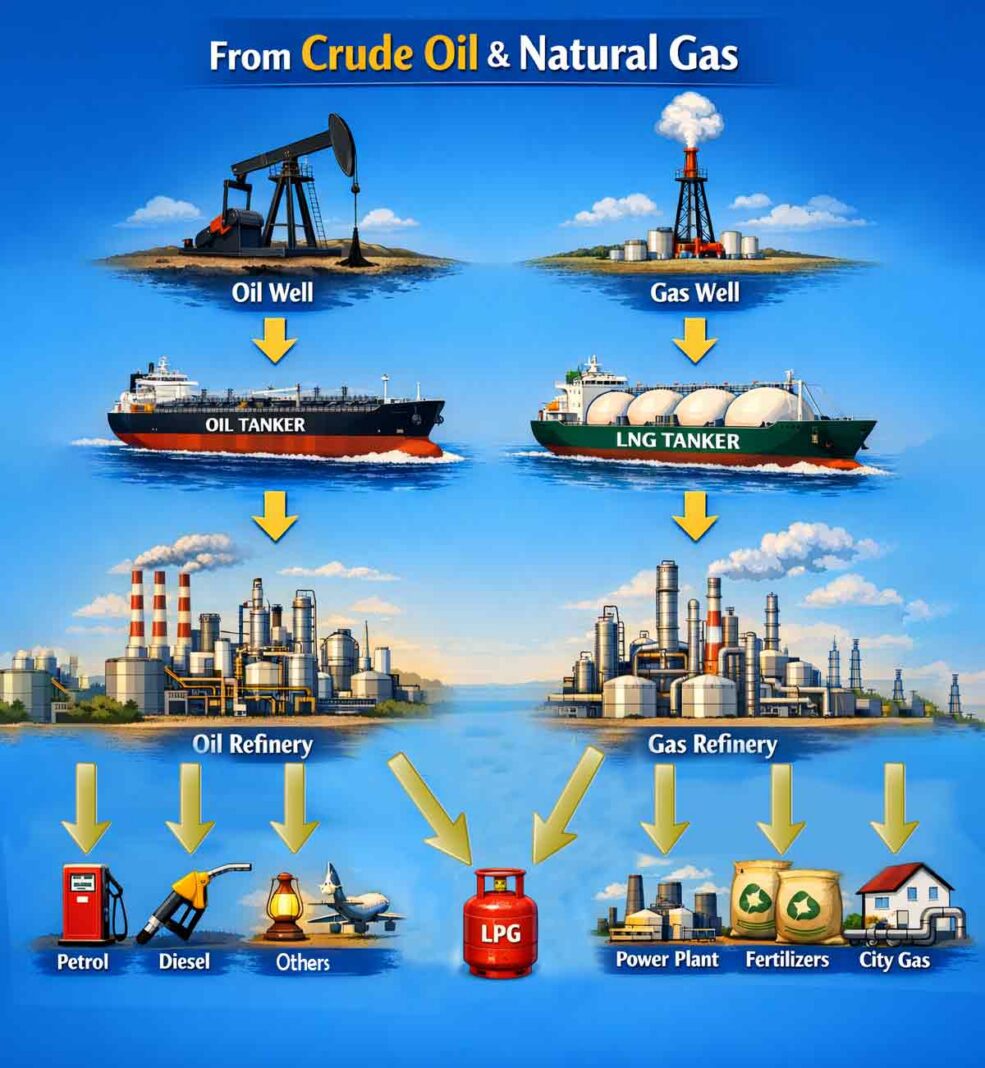 The primary reason for this shortage is that India is dependent on imports for all petrochemical products, including LPG. There are two sources of fossil fuel: crude oil and Natural Gas. While most oil wells produce both oil and gas, some wells produce only gas. These two energy sources are converted to various petroleum products by oil refineries.