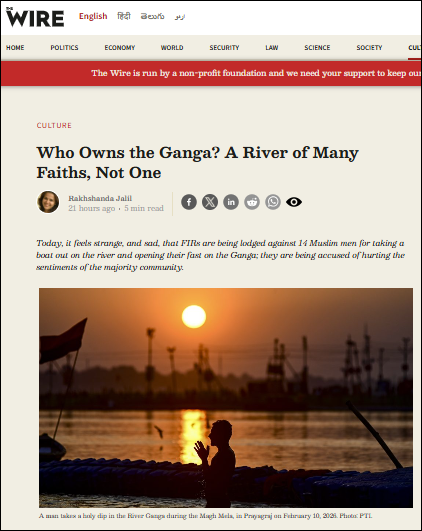 In an opinion piece titled, “Who Owns the Ganga? A River of Many Faiths, Not One“, a Delhi-based writer, translator and researcher, Rakhshanda Jalil, offers family memories, Urdu poetry, and a dash of melodrama to establish a narrative that Ganga is a ‘secular’ river not owned only by Hindus, ironically, by saying that she belongs to many faiths.