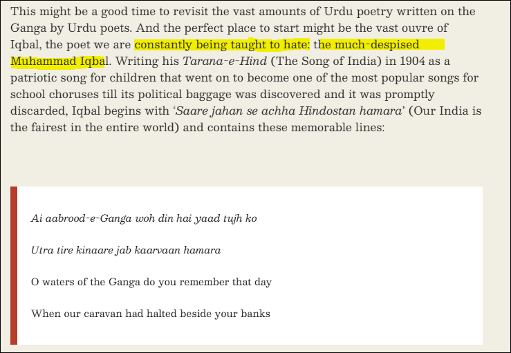 Jalil could not find a better poet than Muhammad Iqbal to contend that since Muslims wrote Urdu poetry on the Ganga River, the river belongs to them as well.