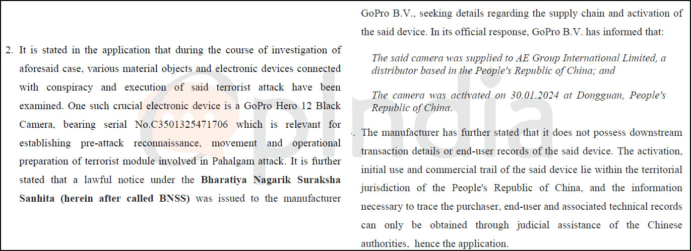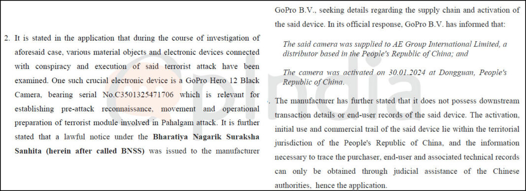 According to the court order accessed by OpIndia, a GoPro Hero 12 Black camera was identified as a “crucial electronic device” in the investigation. The court recorded, “One such crucial electronic device is a GoPro Hero 12 Black Camera, bearing serial No. C3501325471706, which is relevant for establishing pre-attack reconnaissance, movement and operational preparation of terrorist module involved in Pahalgam attack.”