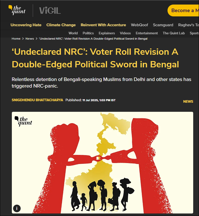 Despite this, Snigdhendu Bhattacharya, who regularly writes for Islamo-leftist rags like The Wire, Newslaundry, The Quint, Article-14, etc, and in a Quint article called the SIR in Bengal, “undeclared NRC”, decided to rely on anecdotal cases and TMC/ party sources rather than ECI’s official data and the Supreme Court’s oversight.