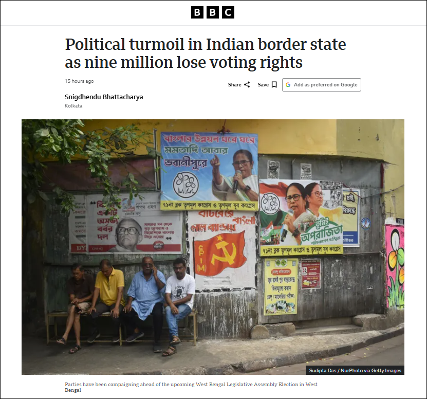 The BBC, however, downplayed the fact that it is Hindus who comprised 63% of the deletions in absolute terms. Even some Hindu-dominated areas like Paschim Bardhaman and the Matua community pockets in North 24-Parganas saw significant deletions. Despite this, the BBC article, though, acknowledges Hindu voter deletions, frames the SIR exercise around Bangladeshi Muslim infiltration and pushes an anti-Muslim conspiracy narrative, almost as if to incite panic and violence in a state where Islamist-orchestrated lawlessness is more normal than peace.