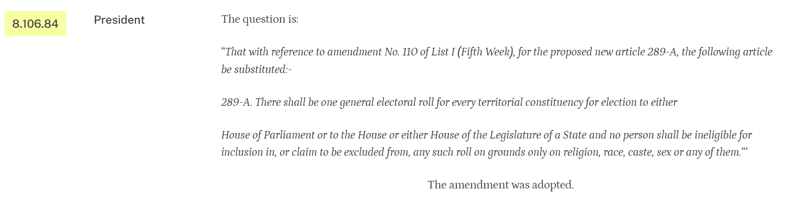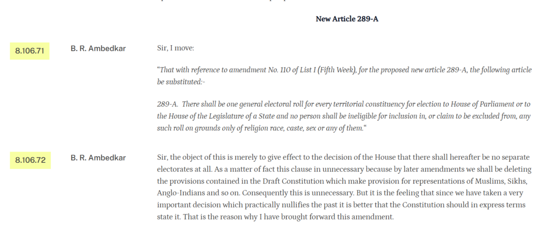 The former highlighted that “the object of this is merely to give effect to the decision of the House that there shall hereafter be no separate electorates at all. As a matter of fact, this clause is unnecessary because by later amendments we shall be deleting the provisions contained in the Draft Constitution which make provision for representations of Muslims, Sikhs, Anglo-Indians and so on.”