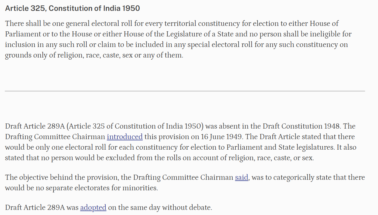 The 1948 Draft Constitution did not include Draft Article 289A, which was subsequently enacted as Article 325. On 16th June 1949, the Chairman of the Drafting Committee introduced this provision. It specified that each constituency would have a single electoral roll for polls in state legislatures and Parliament.