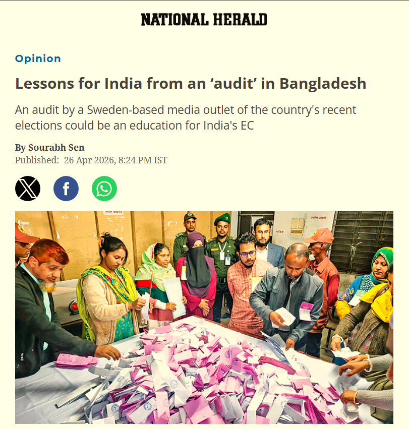 Now, comparisons are made with fractured democracies, and sermons are delivered to “learn” from them in a renewed, desperate initiative by this group. On 26th April (Sunday), the Congress mouthpiece “National Herald” published a column titled “Lessons for India from an ‘audit’ in Bangladesh” by Sourabh Sen, which directed the Modi govt to draw insights from the recently concluded national parliament polls in the neighbouring country.