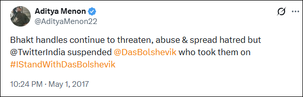“Bhakt handles continue to threaten, abuse & spread hatred but @TwitterIndia suspended @DasBolshevik who took them on #IStandWithDasBolshevik,” Menon posted in May 2017.