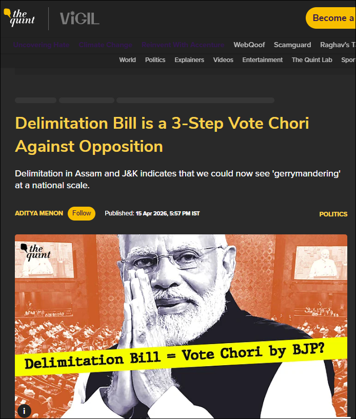 The Modi government is set to table the Constitution (131st Amendment) Bill, 2026, in a Special Session of Parliament scheduled for 16th and 17th April. The bill aims to raise the strength of the Lok Sabha from 543 to 850. Even before being brought on the floor of the parliament, the Bill’s delimitation proposal has outraged anti-BJP parties and the leftist media cabal. While parties like Congress and DMK have claimed that delimitation in its proposed form would reduce the seats of southern states, the leftist propaganda outlet The Quint has declared it a “3-step vote chori”.