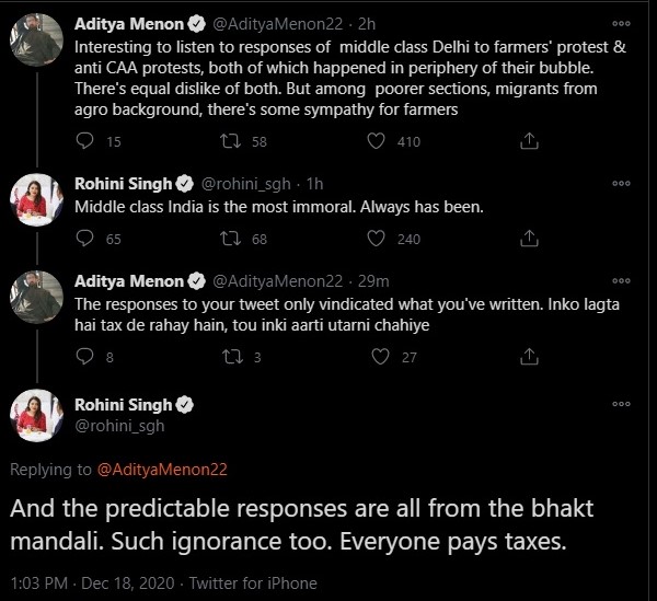 Back in December 2020, Menon had published an X post villainising the Delhi’s middle class, for their non-support to the anti-CAA and farmers’ protest. He received support from propagandist Rohini Singh, who called the Indian middle class “most immoral”.