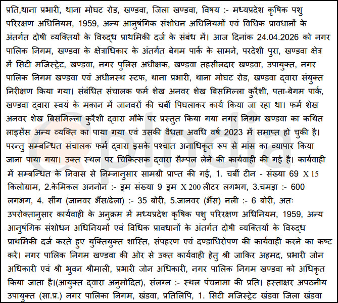 SHO Dharwal stated that he received a letter from the Municipal Corporation, Khandwa, signed by Zakir Ahmed and Bhuvan Shrimali, in charge zone officers, to register an FIR in the matter.