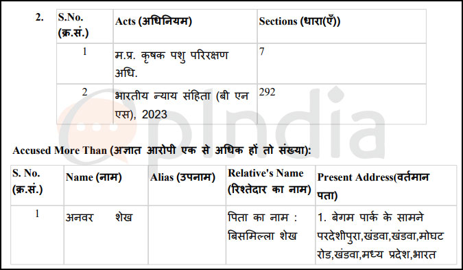 OpIndia accessed the FIR in the matter. It has been registered on the complaint of the zone in charge of the Municipal Corporation of Khandwa at Moghat Road police station, Khandwa, Madhya Pradesh, under Section 7 of the Madhya Pradesh Agricultural Cattle Preservation Act and Section 292 of the Bharatiya Nyaya Sanhita (BNS) against Anwar Sheikh Bismillah Qureshi.