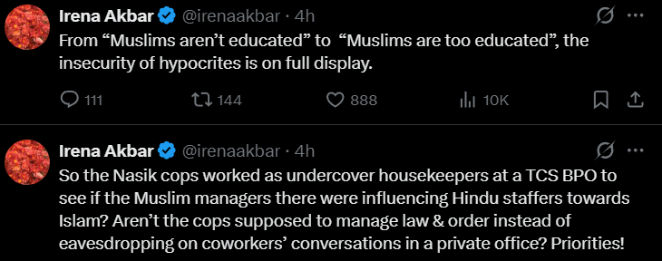 Irena Akbar, a former “journalist,” sought to misrepresent the incident by implying that Muslims are being unfairly singled out for their education and taking job opportunities, which is not unusual for an extremist, who is known for distorting reality to suit her goal. She also criticised the female police personnel who went undercover at the firm to bust this syndicate, mocking that their attention should be on maintaining law and order rather than eavesdropping on private office discussions.