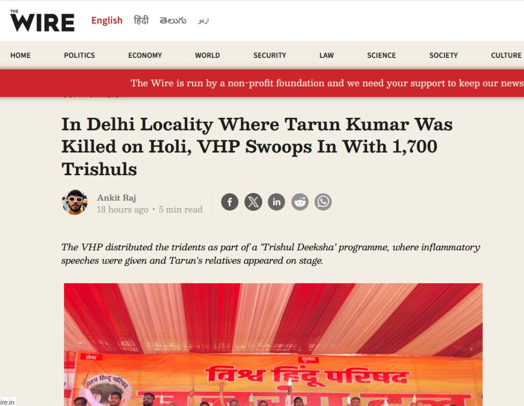 Most recently, on Monday, April 13th, the organisation released a fresh piece of propaganda targeting an event organised by the Vishwa Hindu Parishad (VHP) at Ayyappa Park in Hastsal, Uttam Nagar. The event, held on Sunday, April 12th, was a “Trishul Deeksha” program, yet The Wire chose to report on it with a heavy dose of fearmongering. The article titled, “In Delhi Locality Where Tarun Kumar Was Killed on Holi, VHP Swoops In With 1,700 Trishuls”