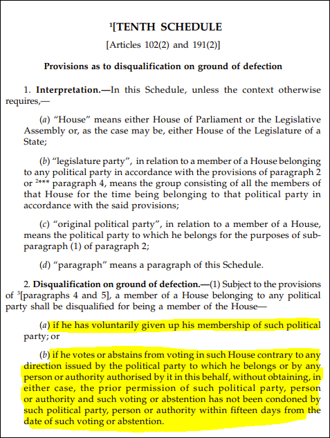 “(a) if he has voluntarily given up his membership of such political party; or (b) if he votes or abstains from voting in such House contrary to any direction issued by the political party to which he belongs or by any person or authority authorised by it in this behalf, without obtaining, in either case, the prior permission of such political party, person or authority and such voting or abstention has not been condoned by such political party, person or authority within fifteen days from the date of such voting or abstention,” the law states.