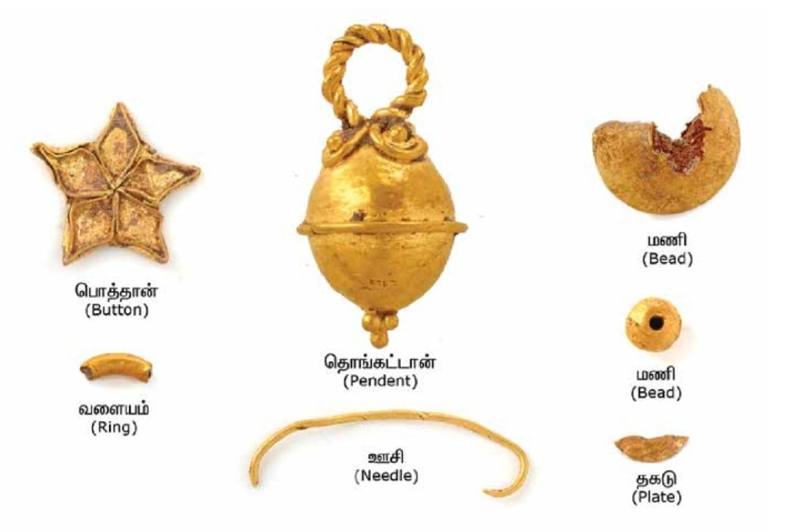 The ASI conducted the first three of the eight rounds of excavations. After the Tamil Nadu State Department of Archaeology (TNSDA) assumed responsibility for the project, the artefacts accumulated to over 18,000, which included pottery, inscribed potsherds, gold ornaments, copper articles, semi-precious stones, shell and ivory bangles, glass beads, spindle whorls, terracotta seals, and weaving tools.