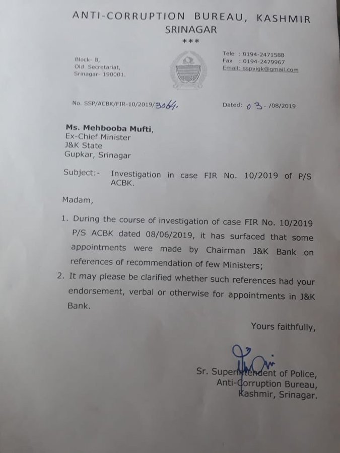 The Anti Corruption Bureau notice to Mehbooba Mufti says that during the course of the investigation, it has emerged that few appointments in the Jammu and Kashmir Bank case were made on the recommendation of few ministers.