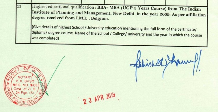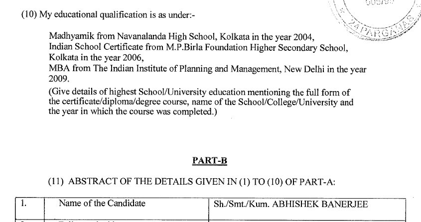 According to the affidavits submitted by Banerjee during 2014 and 2019 Lok Sabha elections, he obtained an MBA degree from Indian Institute of Planning and Management (IIPM) in the year 2009. The 2019 affidavit additionally mentions “as per affiliation degree received from I.M.I., Belgium”.