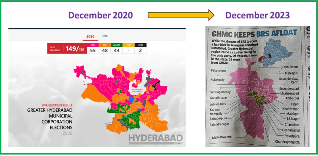 For a party like the BJP that did what they did in MP and Chhattisgarh, it is indeed a mystery as to why they gave up on Telangana. Yes, we can list out all the missteps the party took in the run-up to the 2023 elections. We can talk about the mathematics of the election. In fact, I started this article to explain the mathematics behind BJP’s loss. Using the below graphic, I wanted to explain how the party that took GHMC by storm in 2020 has failed woefully in 2023 in the exact same area.