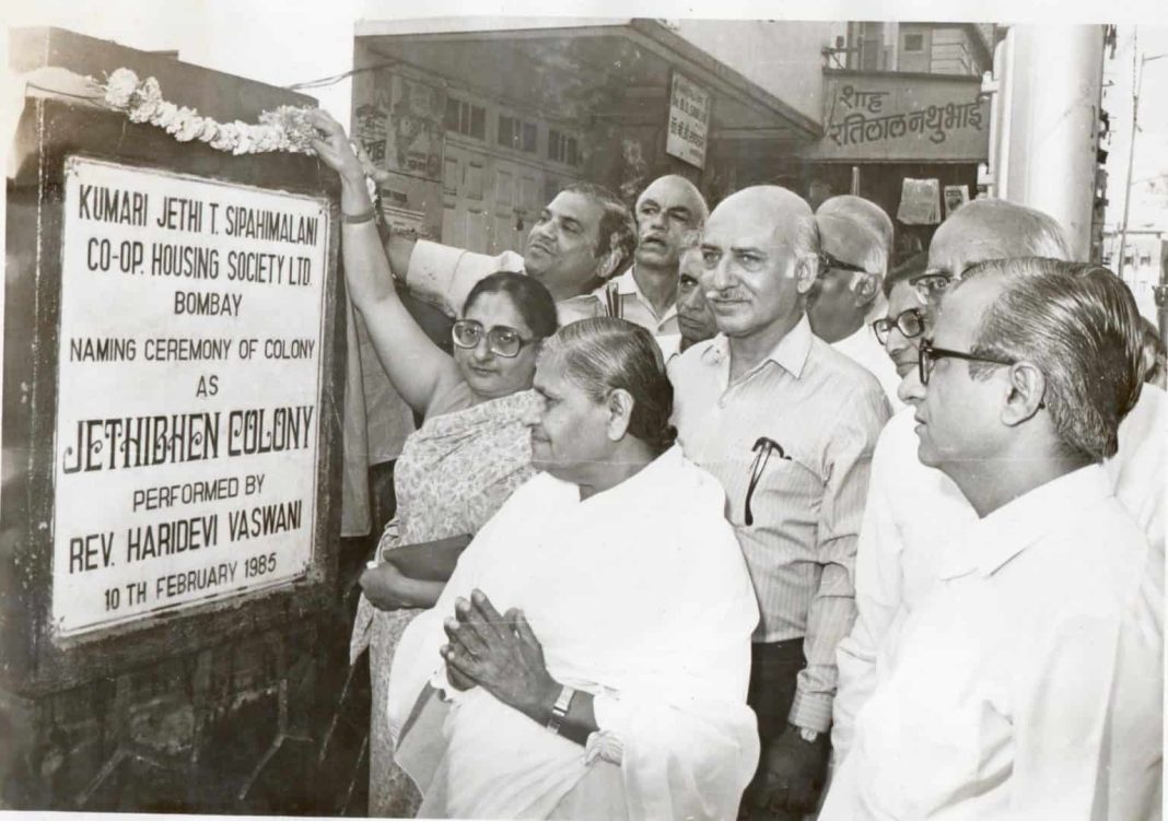 In 1956, Jethiben procured the land for the Navjivan Society. She applied for a loan from The Bombay Co-operative Housing Finance Society Limited in 1958 receiving a construction cost of Rs 20,59,000/-. This allowed the members to avail of flats on a non-profit basis at a payback instalment of Rs 200 a month. By 1978, with all dues cleared, Mahim and Mumbai at large had embraced the essence of Sindh. Jethiben did not marry; she adopted a son, the late Mangharam Sipahimalani, and devoted her life to the development of the Sindhi community in India.