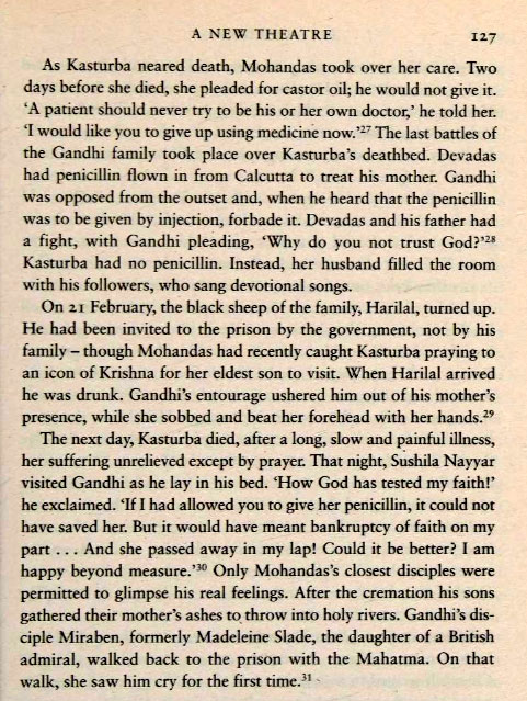 Kasturba was down with pneumonia. Doctors wanted to administer Penicillin, the anti-pneumonia drug that had saved millions. But Gandhi forbade it. He even fought with his son. "I am happy beyond measure," he exclaimed when Ba died the next day.